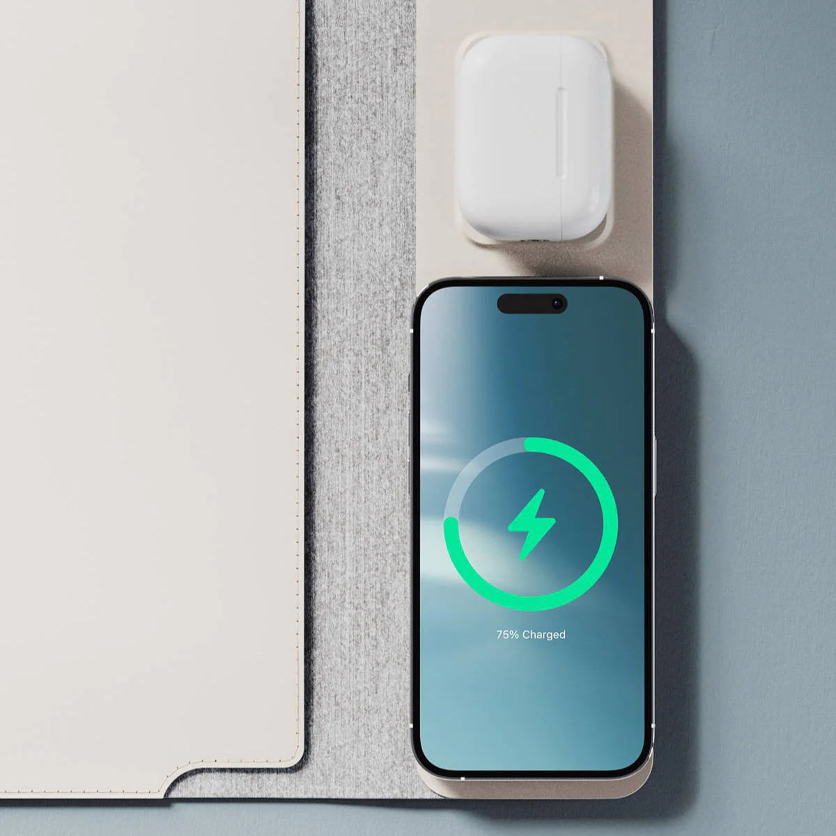 Incluye dos cargadores inalámbricos rápidos para tu móvil y AirPods. Sin enchufes, sin desorden.